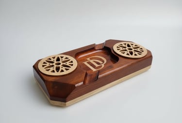 Soporte (o posavasos) para whisky y cigarros a medida, hecho artesanalmente con madera premium y detalles grabados. Diseñado como un regalo único y súper personal para un cliente.