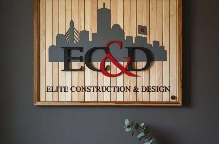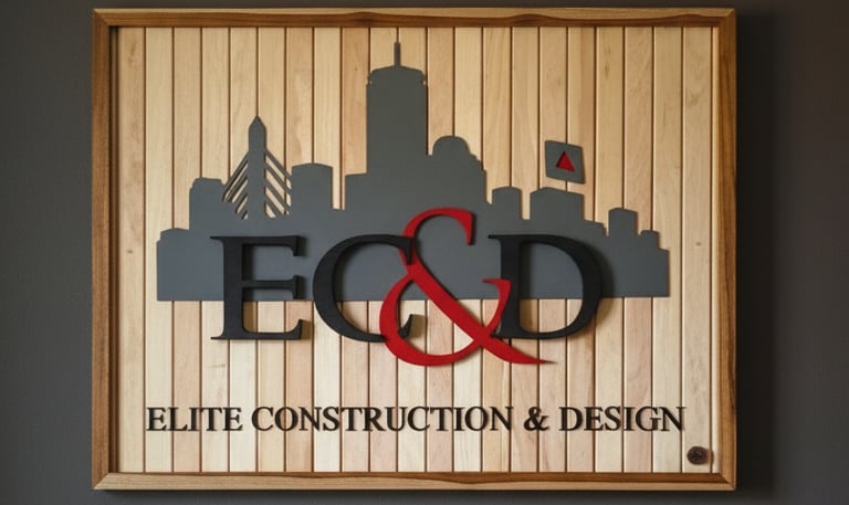 Cartel de negocio a medida para Elite Construction & Design (EC&D), laburado con madera recuperada, letras hechas con precisión por CNC y un acabado prolijo y profesional. Ideal para la oficina.